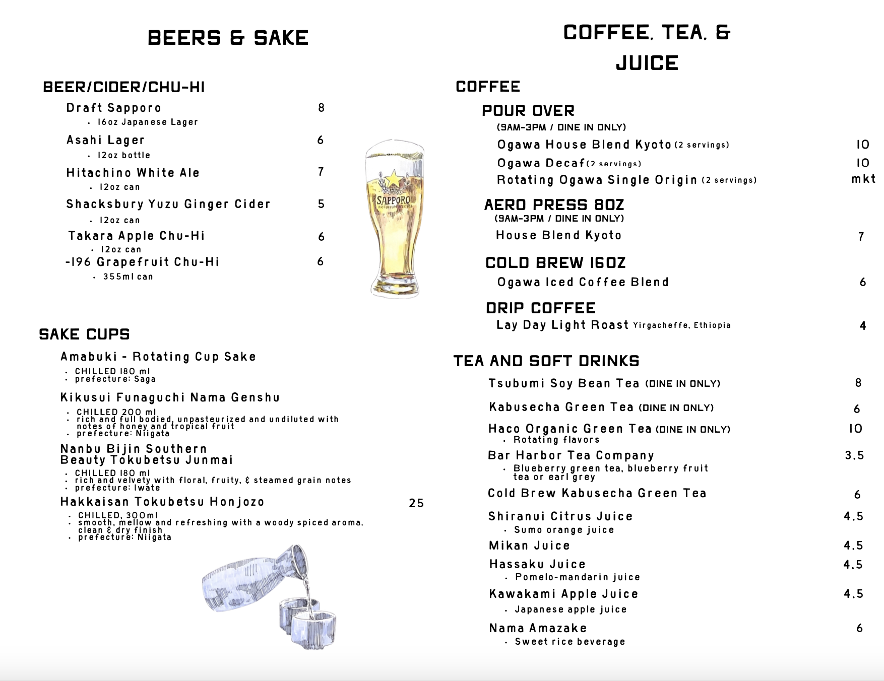We serve thoughtfully prepared coffee and tea throughout the day, along with Japanese soft drinks. For lunch and dinner, our drink menu expands to include sake by the cup, Japanese beer, and chu-hi. See below for a full list of drink offerings.